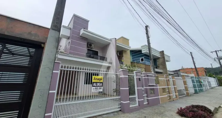 Casa geminada com 3 quartos com ar condicionado, sendo 1 suíte, área externa com churrasqueira e 2 vagas de garagem, sendo 1 descoberta, no Bairro Aventureiro. Imóvel com sala de estar e jantar, cozinha com armários, 1 lavabo, 1 banheiro social e área de serviço externa.