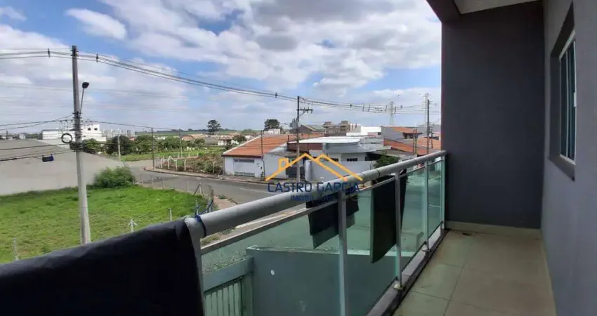 Imóvel no piso superior com três dormitórios, sendo uma suíte, sala de estar com sacada, cozinha, banheiro social e área de serviço.