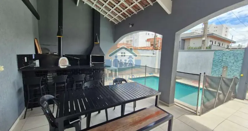 3 dormitórios (2 suítes), com ar-condicionado, sala de estar, cozinha ampla equipada e com armários planejados, amplo quintal para 5 vagas de garagem (1 vaga coberta) e área gourmet com churrasqueira à carvão, forno de pizza, piscina, 3wc e área de serviços.
