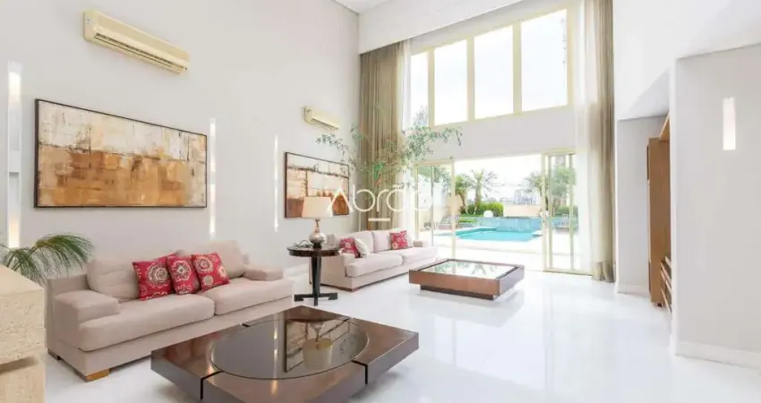 No pavimento térreo, o destaque é o amplo living com pé-direito duplo, dividido em 4 ambientes integrados, proporcionando elegância e versatilidade na decoração. O espaço conta com ar-condicionado, lareira e portas de vidro, garantindo abundante iluminação natural e integração com a área externa.