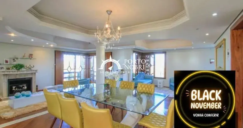 EXCELENTE CASARÃO VENDA/ALUGUEL - 495.8m², Ampla Residência 04 dormitórios sendo 03 suítes e 08 banheiros, composta por:Subsolo: Home office, adega, banheiro auxiliar, piso cerâmico, escadaria com granito com acesso interno a casa;1° Nível: Estar com lareira, lustres em cristal, espera para calefação, Taboão, decoração em gesso, acabamento com pé direito duplo, hall de entrada, estar de TV:2°Nível: Sala de estudo, hall íntimo, 02 suítes americana com sacada, varanda, banheiro social, suíte máster com varanda, closet e hidromassagem;3° Nível: Sótão com varanda, sala de jogos e descanso, lavabo e depó(link removido) com acesso a piscina aquecida e (link removido) toda murada com pedras e gradeada, acabamentos em madeira nobre com vista panorâmica para contemplar o pôr do sol.