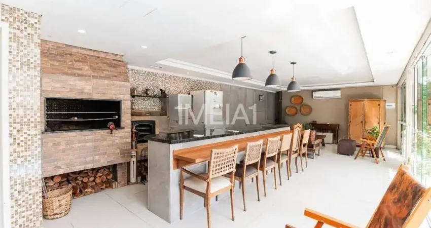 Nos fundos, pátio amplo com gramado, árvores frutíferas, piscina com deck, salão de festas completo com lareira, churrasqueira e fogão a lenha.