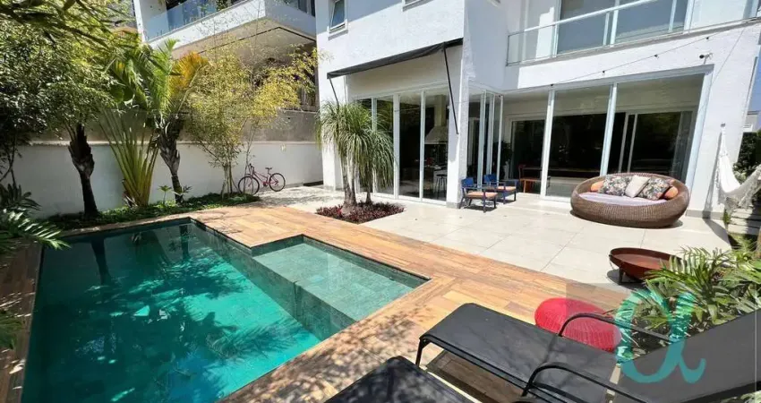 Casa para venda e locação no Condomínio Residencial Tamboré 10. Conta com 4 amplas suítes com closet, suíte master com banheira de hidromassagem, escritório, sala de estar, sala de jantar, sala de TV, lavabo, cozinha com armários, área de serviço com lavanderia, toda integrada, com vista para a mata, área gourmet, churrasqueira, piscina aquecida e 2 vagas cobertas de garagem.