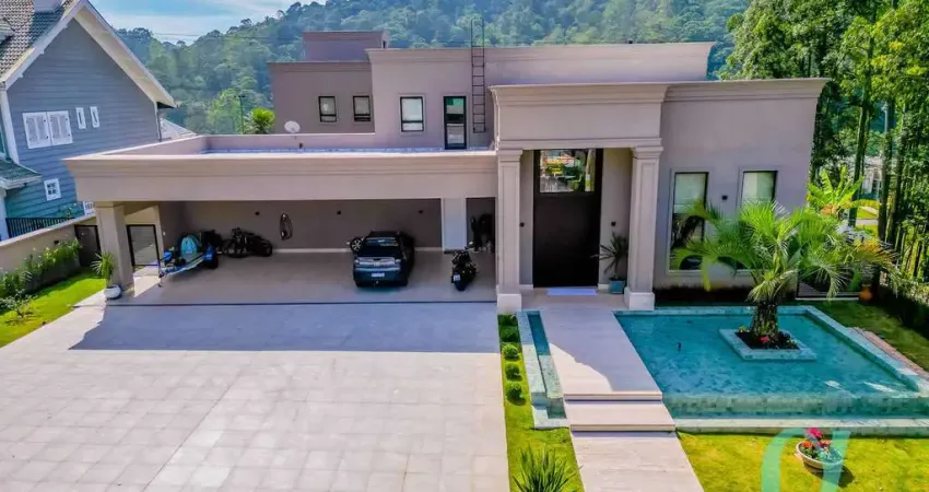 Mansão com 1.000 m2 de área construída em terreno de 1.960 m2, com 5 suites, sendo 4 no andar superior e 1 no andar térreo (configurada para PCD), vista permanente para o Morro Jaraguá Mirim, espelho d’água, automação completa, ar condicionado linear (central em toda a residência), aspiração central, elevador, adega, escritório, lavabo, sala com pé direito duplo de 6m, sala de cinema, escada em curva feita sob encomenda, móveis da ID House, toda mobiliada, eletrodomésticos da marca Gorenge, área gourmet com churrasqueira, frigobar e cooktop da elettromec, jacuzzi para 6 pessoas, sauna, academia com vista para a mata, fogo de chão, piscina aquecida com borda infinita e raia de 18m, horta, dependência de funcionario, depósito de maquinas, sisterna coleta de agua de chuva com capacidade de 30 mil litros, usina fotovoltaica, gerador a gás, garagem coberta para 5 carros, podendo usar até 15 carros na área descoberta, carregador de carro elétrico plug-in, e como diferencial, tem um rancho com tanque com mais de 1.000 tilápias, galinheiro, casinha de coelho, balanço, pomar com várias árvores frutíferas, quiosque com fogão a lenha e redário.