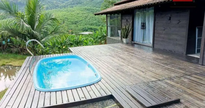Terreno com 5.676m², contendo uma casa com 1 dormitório com closet e banheira, sala de estar/TV, cozinha com forno a lenha, deck com piscina e cascata e uma linda vista para lagoa.