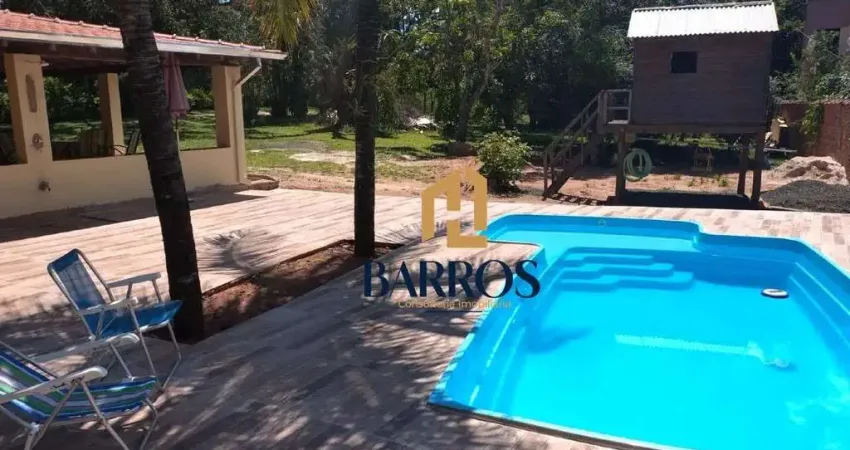 A residência conta com sala, cozinha, banheiro social e 2 dormitórios, todos equipados com ventiladores de teto, além de armários embutidos que garantem funcionalidade e organização. A área externa é um grande destaque, com churrasqueira, piscina nova, banheiro externo, pomar formado e uma charmosa casa de boneca, perfeita para momentos em família e lazer das crianças.