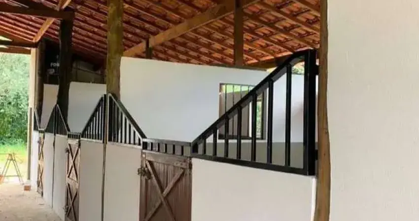 07 baias, sendo 1 baias maternidade com 3,5m² x 7m², farmácia, quarto de selas, 3 banheiros, lavador para animais, galpão para implementos, poço caipira;