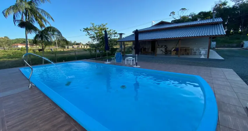 Chácara com aproximadamente 1000 m² de área, toda cercada, contendo casa com 3 quartos, sendo 2 suítes, banheiro social, cozinha, fogão a lenha, sala grande e 3 vagas de garagem e piscina com 44m³. Ótimo espaço gourmet. Mobiliada. 140m² de área construída.