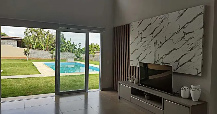 Uma chácara de campo totalmente nova e térrea em conceito aberto e integrado, muito confortável, trazendo muita luz e ventilação natural.