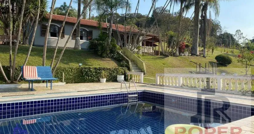 Chácara com 24.000 m² área total. Casa sede avarandada com 3 dormitórios, sala com lareira , sala de estar e sala de jantar, 2 banheiros, cozinha, lavanderia e 10 vagas. Estrutura e Lazer- Área gourmet com churrasqueira e forno de pizza, pomar, jardim, casa de caseiro com 2 dormitórios, sala, cozinha, lavanderia, banheiro e 6 vagas de garagem, casa de ferramentas com 3 cômados, baia para 4 cavalos, bosque, mata, nascente de agua limpa, lago, compo de futebol.
