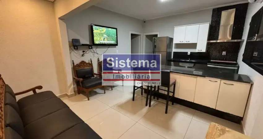 Sala com cadeiras e uma TV, integrada à cozinha.