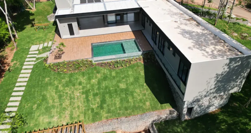 Casa térrea moderna com projeto paisagístico lindo integrado com a natureza, fachada com painel ripado, 4 suítes plenas todas com vista para a área de lazer, sala ampla integrada com a cozinha, está rica em armários e com bancada em ilha!