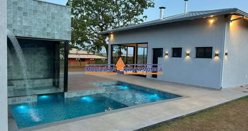 Sítio de 2.000m² (1.000m² cada lote) com uma casa plana com acabamento de alto padrão com quatro quartos sendo um com suíte e closet, sala, banheiro social, cozinha ampla com pé direito mais alto conjugada com área gourmet com fogão cooktop, churrasqueira, fogão a lenha, área de serviço separada em local privativo, piscina aquecida com sistema de aquecimento solar, cascata, ofurô, conexão direta com a sauna pela piscina, sauna com aquecimento elétrico, nos fundos possui um banheiro social, uma área de lazer coberta e dois cômodos menores para guardar ferramentas e instrumentos da piscina. Na frente possui garagem coberta para quatro carros.