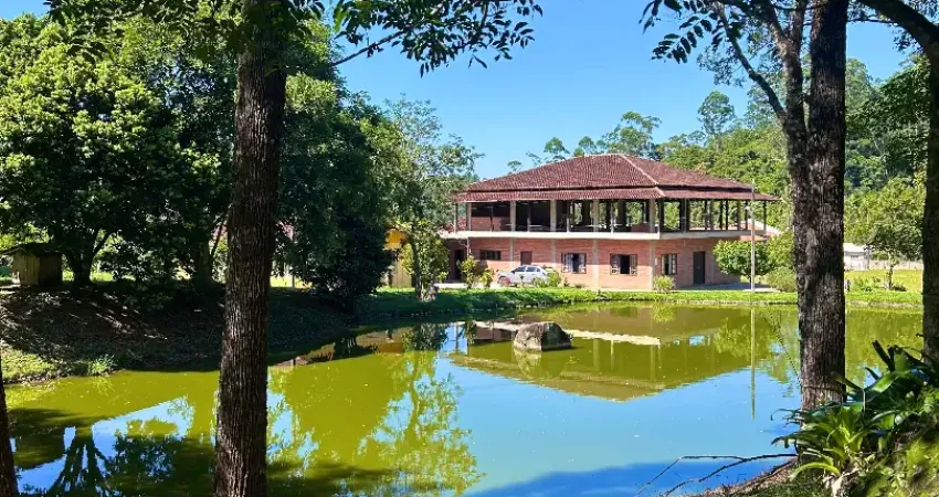 Sítio com aproximadamente 11.000m², cercado por natureza, com lago em frente à casa principal e cachoeira dentro da propriedade.