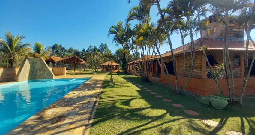 Sítio à venda em Itu/SP com 8 alqueires de área total e 1.200 m² de área construída. A casa principal é térrea, toda avarandada, composta por 4 suítes internas e 2 suítes externas, sala ampla em dois ambientes, lavabo e cozinha grande. A área de lazer é completa, com salão de festas equipado com churrasqueira, forno de pizza e fogão a lenha, piscina de grandes dimensões, dois quiosques (sendo um com churrasqueira), capela, quadra poliesportiva e um espaço spa com saunas seca e úmida, ofurô, duchas e dois banheiros de apoio.