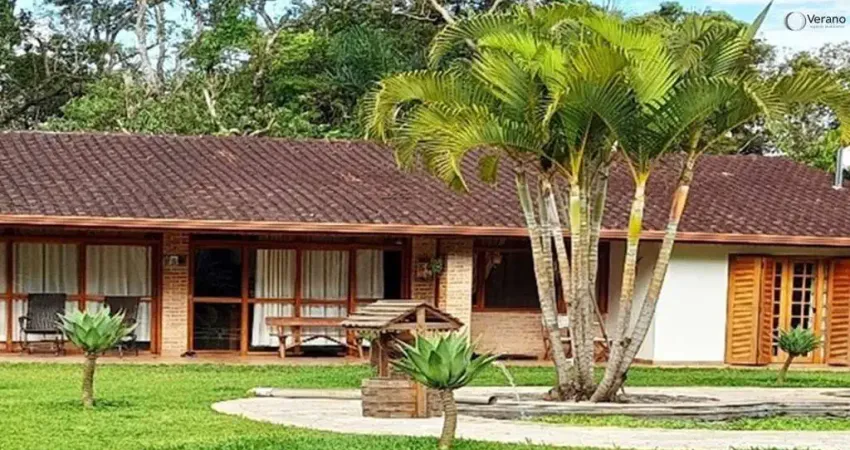 Casa Sede: 3 dormitórios (1 suíte), 2 banheiros, sala com lareira e cozinha americana integrada.