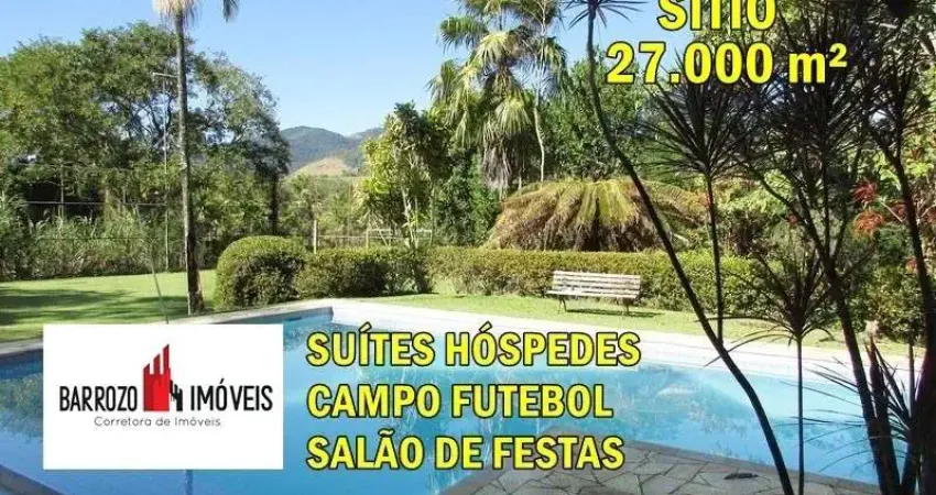 Sítio de 27.000 m² com casa sede de 4 quartos, sala com 2 ambientes, 2 banheiros sociais, cozinha; 3 suítes externasindividuais para hóspedes; 1 casa de caseiro; área de lazer com piscina de alvenaria, campo de futebol, salão de festas, churrasqueira, fogão à lenha; galinheiro, horta; gramado, cercado, gramado, frutíferas.