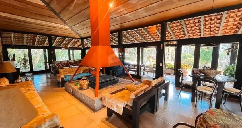 A casa principal é ampla, acolhedora e bem planejada, composta por quatro suítes confortáveis, cozinha funcional, sala de jantar e uma generosa sala de estar com lareira central, que imprime charme e aconchego ao ambiente. Um elegante varandão em formato de L se abre para o jardim, proporcionando vistas relaxantes e convidando à contemplação do verde ao redor.