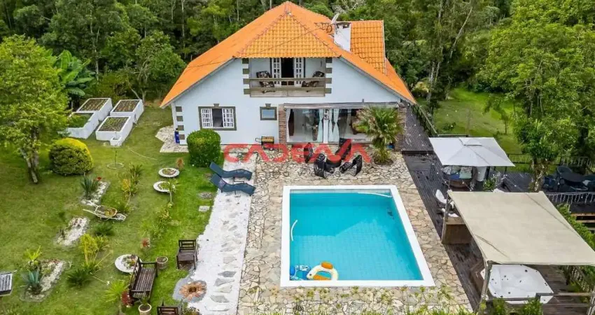 Casa principal reformada com 176m² de área interna, 03 suítes (mobiliada), banheira instalada no quarto de casal, sala da lareira, cozinha com armários novos, ilha e fogão a lenha, sala com mobília / decoração rústica, sofá, mesa de jantar com balcão, armário e mesa lateral e lavabo.