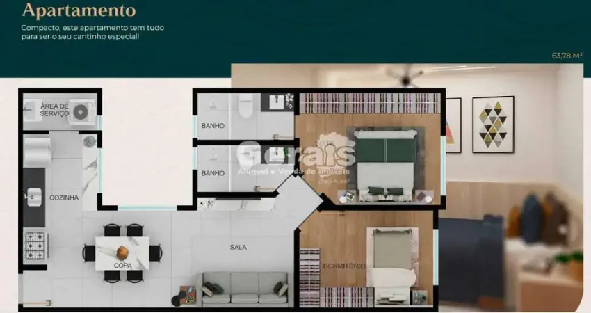 APTO COM: SALA, 02 QUARTOS SENDO 01 SUÍTE, BANHO SOCIAL, COZINHA COM BANCADA, ÁREA DE SERVIÇO, SACADA, INTERFONE, ELEVADOR, LUMINÁRIA, 01 VAGA DE GRAGEM, PORTÃO ELETRÔNICO, TETO EM GESSO, PISO EM PORCELANATO E DURAFLOOR, PINTURA NOVA, ÁREA APROX 63M².