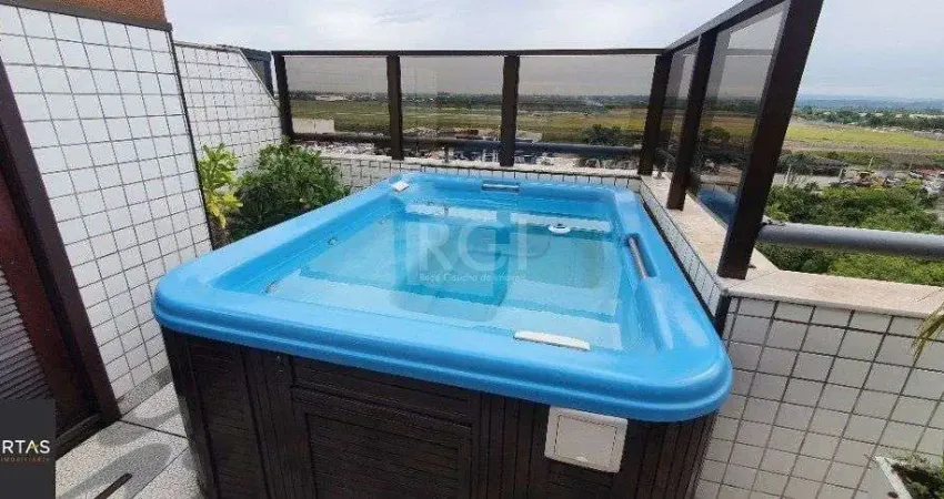 Linda Cobertura com Jacuzzi de Frente com 2 dormitórios, suíte, sacada integrada, living amplo, decorada, ótimo acabamento, cozinha mobiliada, área de serviço, água quente, banheiro social, parte superior com ampla sala de estar com lareira, parte coberta com polietileno e fechamento retrátil, churrasqueira, banheiro auxiliar, terraço parte descoberta com jacuzzi, ótimo sol norte, vista panorâmica, prédio ótimo com elevador e zelador, medidores de gás e agua individuais. Estuda possibilidades de receber imóvel de pequeno valor e carro, aceita financiamento/Fgts. Vale a Pena Conhecer! Para agendar sua visita ou para mais detalhes sobre este imóvel ligue a gente tem o imóvel certo para você, nossa equipe de corretores é experiente e profissional, entre em contato e comprove.. ASSISTA O VÍDEO e ligue para nós! Estudamos seu imóvel no negócio. Além deste, mais de 25 mil opções em nosso site.