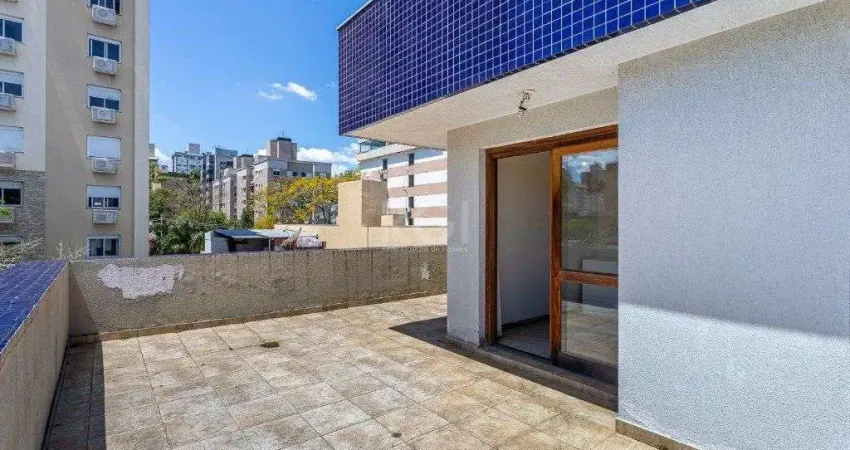 Ótima cobertura no bairro Petrópolis, próximo do Zaffari Ipiranga, desocupada, com 135m² privativos, de 2 dormitórios e 2 vagas. Possui no pavimento inferior: living amplo com sacada integrada, 2 dormitórios, banheiro com box de vidro, cozinha mobiliada e área de serviço separada. No pavimento superior possui: ampla sala de estar com churrasqueira, lavabo e amplo terraço com ótima vista. Piso laminado no andar inferior e cerâmico no superior. Água quente na cozinha e banheiro. Possui 2 vagas de garagem (lado a lado). Condomínio com interfone, portão eletrônico, gás central e elevador. Localizada em ótima região próximo da Av Ipiranga, do Zaffari, a poucos minutos da PUC e da UFRGS, com todos os recursos próximos. Documentação ok. Agende já uma visita.