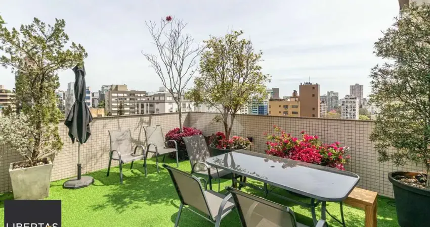 Cobertura no Moinhos de Vento com 185 m2 muito iluminada com 2 dormitórios sendo 1 suíte ampla sala para dois ambientes banheiros com ventilação direta escada confortável e elevador com acesso ao piso superior que conta com estar com área de churrasco espaço para lareira e ampla área externa com vista definida. Preço e disponibilidade do imóvel sujeitos a alteração sem aviso prévio.