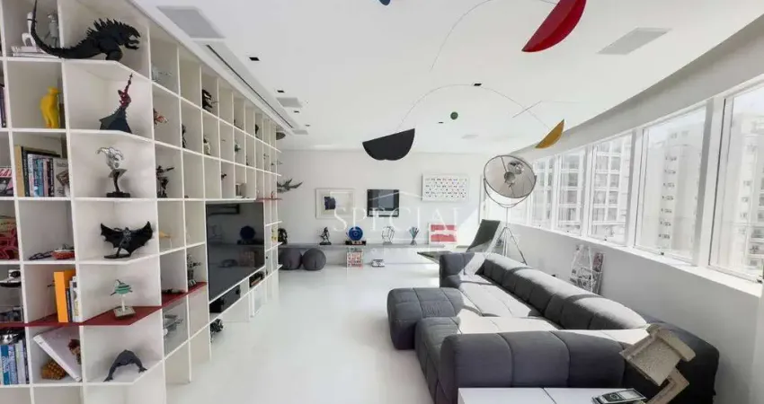 2 suites (conversíveis para 3 suites) + escritório e uma salinha. . 4 vagas de garagem . 2 depósitos . cozinha completa e equipada . sistema de ar condicionado central em todo o apartamento . persianas e toldo automatizados . sistema de acesso biométrico . sistema de câmeras . terraço com piscina climatizada, churrasqueira e sistema de irrigação de jardim . banheira com hidro . sauna integrada . tela de projeção e projetor embutidos . Apartamento iluminado com excelente insolação (face norte) . Iluminação de chão para escada e andar de cima. Equipamentos inclusos: - Sistema de AC - Forno, micro-ondas, geladeira/freezer, lava louças, fogão, gaveta aquecida - 2 lavas/secas roupas, com 2 lava-roupas de pequeno porte para outras peças - 2 camas de casal Auping, motorizadas - 1 Esteira ergométrica - 3 Televisões, sistema de som 5.1 - Projetor AV - Seca toalhas nos banheiros - Sofá (Strips), da Hella Jongerius - Lustres nos dormitórios e sala de jantar - 2 robots de limpeza (aspira e lava), da IRoot (modelo: Braava e Romba).