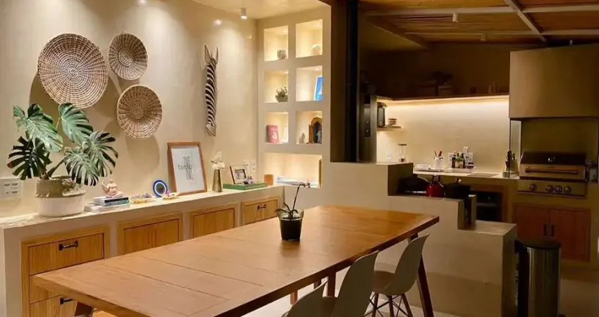 Cobertura Duplex com 160M², 2 dormitórios sendo 1 suíte, 2 cozinhas integradas, uma no piso superior e outra no piso inferior, varanda integrada com a sala, com fechamento de vidros e cortinas blackout, ar-condicionado em todos os ambientes (quarto casal, quarto visita, sala do piso inferior e sala do piso superior). No piso superior: Cobertura com fechamento parcial, com estrutura de aço, teto com bambu feito sob medida e vidro no teto e com portas de correr para a área externa, forno a lenha e churrasqueira embutida, além de toda estrutura de um espaço gourmet e adega seca na marcenaria. A cobertura conta também com 2 vagas de garagem.