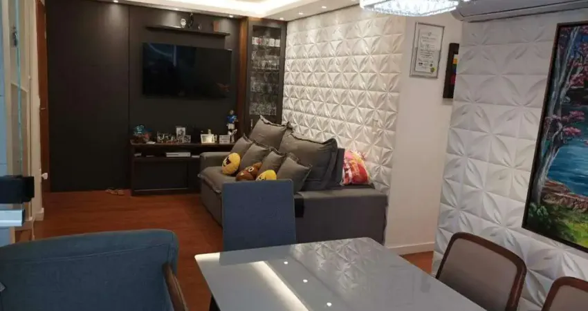 Sala de dois ambientes e corredor, com rebaixamento de gesso, projeto de iluminação, piso laminado, painel planejado com cristaleira e vista;