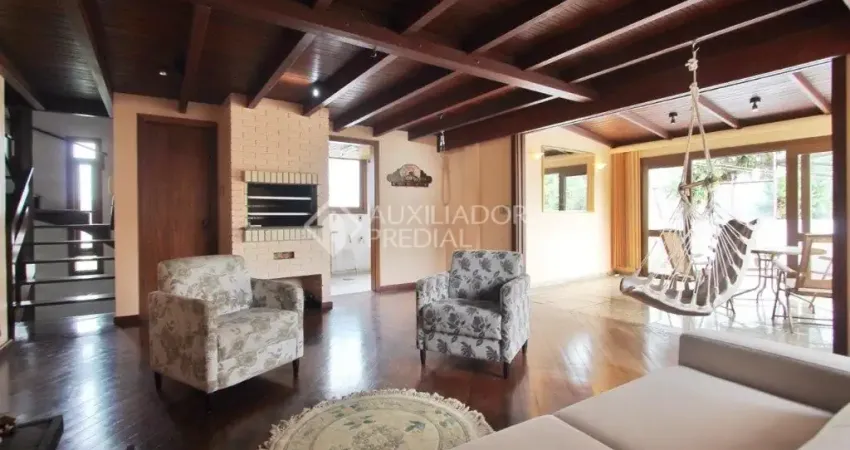 No piso superior, aconchegante living com lareira, churrasqueira e um terraço ensolarado com piscina.