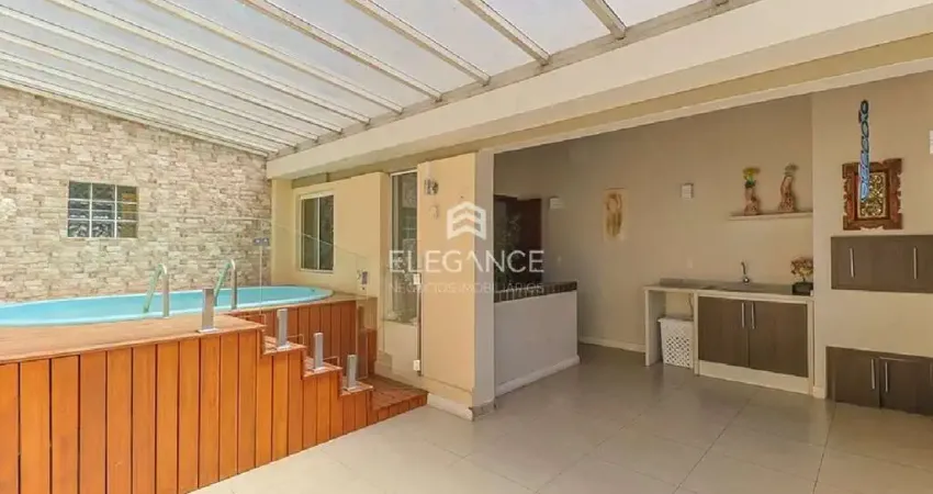 A sala de estar possui uma lareira acolhedora e janelas amplas que garantem luz natural durante todo o dia. A área externa conta com churrasqueira e piscina privativa, criando o ambiente perfeito para momentos de lazer e convivência com a família e amigos.