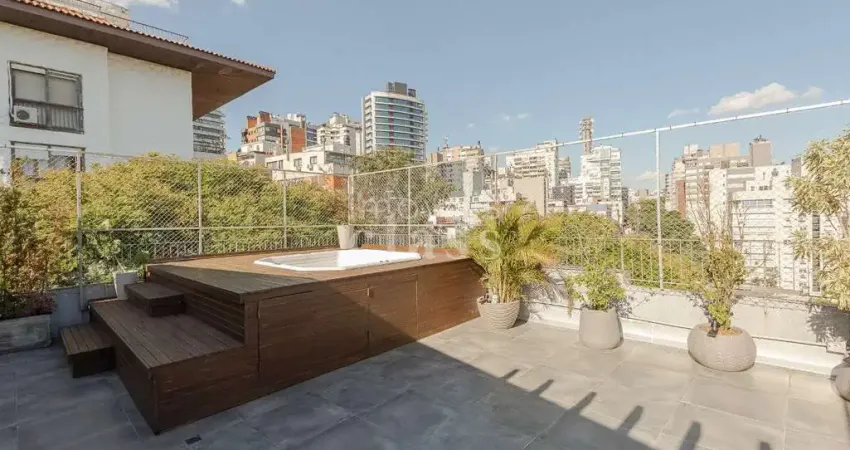 Cobertura duplex de 3 dormitórios e 3 vagas na Lucas de Oliveira, próximo a Casemiro de Abreu. 282 m² de área privativa, 3 vagas cobertas, 3 dormitórios sendo 1 suite e 2 com sacada, living da parte inferior com 3 ambientes amplos, banheiro social, copa/cozinha, área de serviço separada. hall de entrada, dormitório e banheiro de empregada. Na parte superior salão de festas de 4 amplos ambientes, lavabo, churrasqueira, lareira, depósito e enorme terraço com vista definida do Guaíba. São 3 frentes, onde predomina a leste, com sol da manhã e privacidade. Reformado e mobiliado com móveis sob medida, em perfeito estado de conservação. Prédio em centro de terreno e recuado, ajardinado, com tratamento paisagístico. Situado no bairro Bela Vista, em Porto Alegre, parte alta, próximo da Lucas de de Oliveira e Casemiro de Abreu, IPA e não muito longe da Praça da Encol. Cercado de prédios de alto padrão
