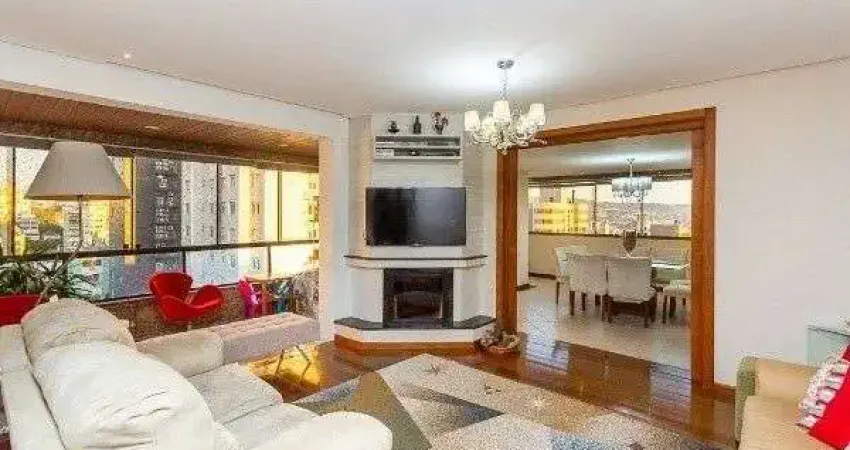 Cobertura espetacular com 329,29m² privativos e 536,52m² de área total. Semi-mobiliada e em excelente estado, oferece amplo espaço, lareira, churrasqueira, sacada com vista panorâmica, área de serviço, lavanderia e jardim.