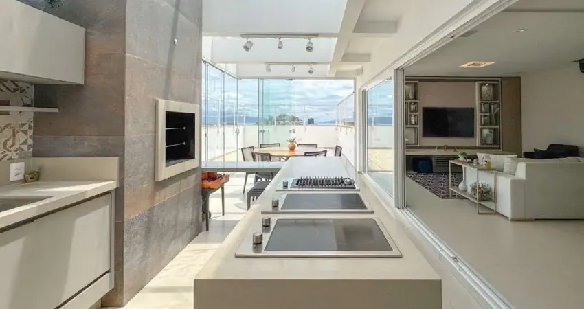 Esta cobertura linear une conforto, metragem generosa e uma vista permanente para o mar, em uma localização estratégica entre os bairros Capoeiras e Estreito, em Florianópolis.