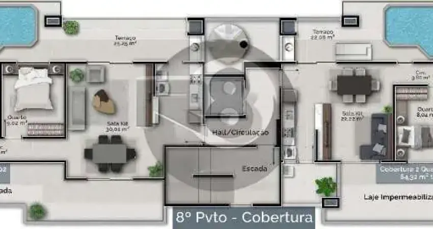 Cobertura plana com 3 dormitórios sendo uma suíte, terraço com piscina e churrasqueira.