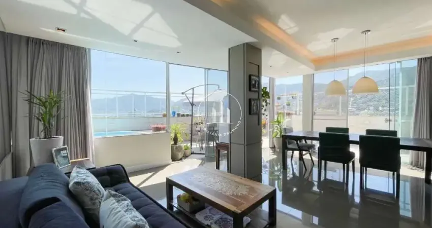 Cobertura 3 quartos em Monte Verde, Florianópolis com 220m² e terraço com jacuzzi. O imóvel possui 3 dormitórios sendo 2 suítes, home office, lavabo, banheiro social, living amplo com cozinha americana, sala de TV, estar e jantar, área de serviço separada e belo terraço. Face solar norte proporciona iluminação natural durante todo o dia, complementada por 2 vagas cobertas e hobby box.
