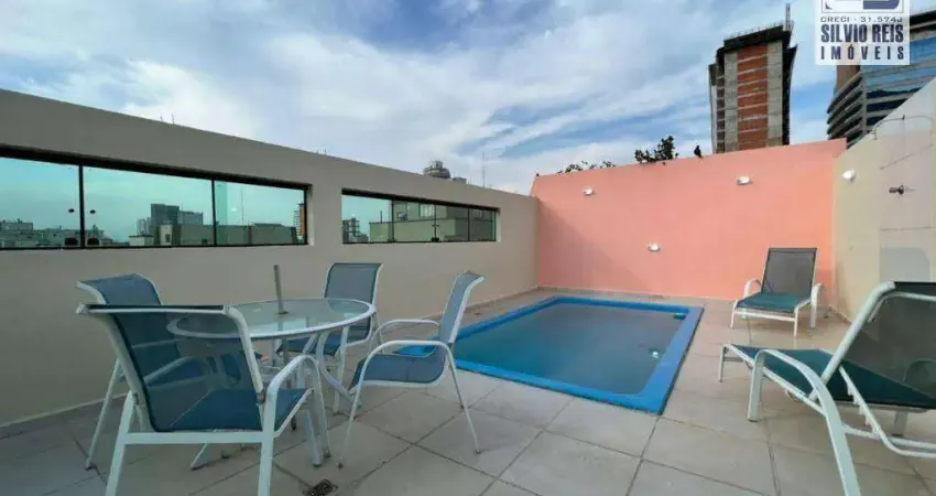 Cobertura com área de lazer ampla, com piscina, churrasqueira, sauna, sala de confraternização e mais uma suíte, tudo isso na área da cobertura.