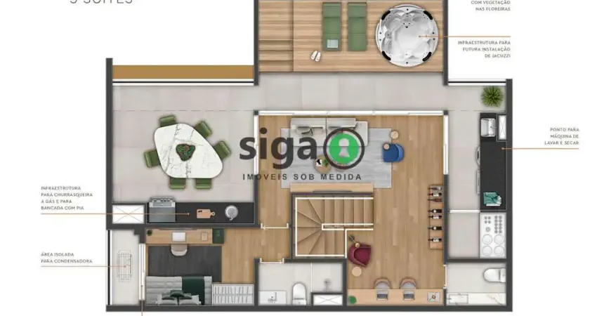 A cobertura duplex oferece planta inteligente e versátil, ideal para quem valoriza ambientes amplos, integração entre os espaços e a possibilidade de criar áreas exclusivas de convivência e lazer privativo no pavimento superior.