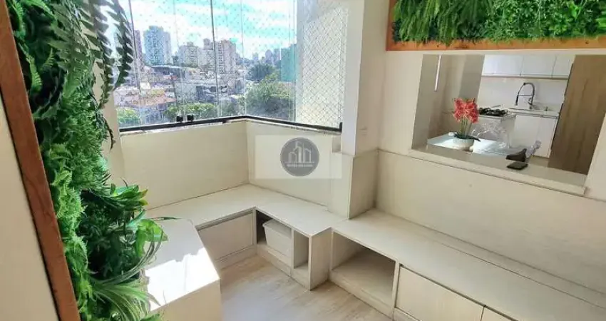 Sala com living (sacada integrada), painel de madeira maciça, jardim vertical, canto alemão com gavetas.