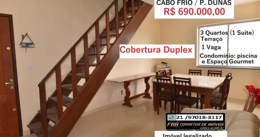 Cabo Frio - Final da Praia do Forte (Dunas) - R$ 690 Mil - Cobertura Duplex - Vista maravilhosa ! PRIMEIRO PISO 1 Sala,1 banheiro Social com armário e box blindex, 3 Quartos com armários embutidos, Cozinha com armários e toda montada, Área de serviço - COBERTURA: 1 Sala pequena, 1 Banheiro Social, 1 Suíte com armário embutido, terraço descoberto - Ideal para um ótimo espaço Gourmet - 1 Vaga de garagem - Condomínio : Espaço Gourmet com Churrasqueira e uma ótima Piscina - Agende sua visita antecipadamente - Aceito e resolvo seu Financiamento Bancário - Só atendo por telefone ou WhatSapp: 21 9 - CÓD. AP00223.