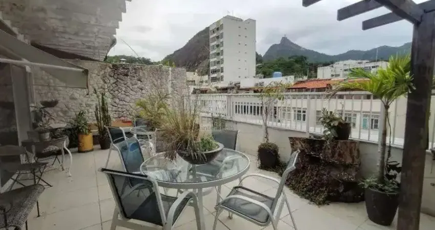 RARIDADE!! ESPETACULAR COBERTURA DUPLEX DE FRENTE COM 214m², REFORMADA, COM BOA ILUMINAÇÃO, SILENCIOSA E COM VISTA LIVRE!! Totalmente reformada em piso porcelanato, clara e silenciosa. O primeiro pavimento oferece um salão para três ambientes, 3 amplos quartos (1 suíte com split), banheiro social e copa-cozinha planejada, além de uma área de serviço generosa com duas dependências. O acesso ao segundo piso é feito por uma elegante escada em granito ou pelo próprio elevador. No andar superior, uma segunda sala se integra ao terraço com pergolado e vista livre para o Cristo Redentor e montanhas, contando ainda com um 4° quarto (suíte máster tipo canadense) e closet. Unidade com sol da manhã, 1 vaga escriturada e pronta para morar.