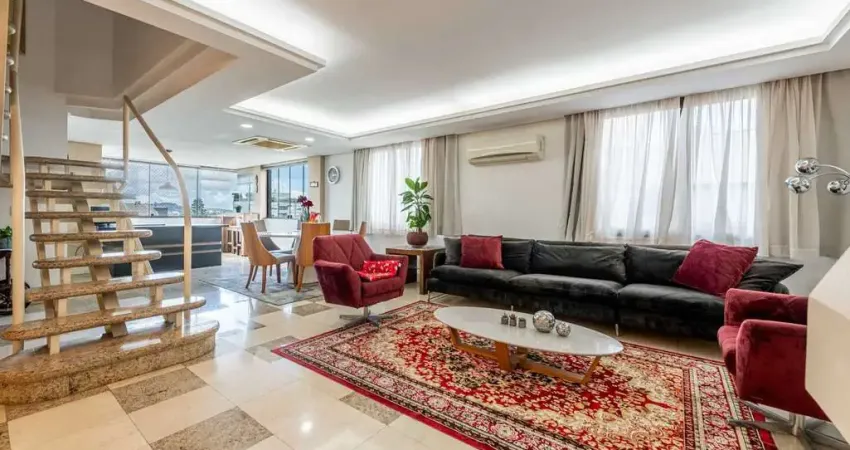 Cobertura semimobiliada de 327 m², 4 dormitórios, sendo 2 suítes e 3 vagas individuais com depósito no bairro Bela Vista.