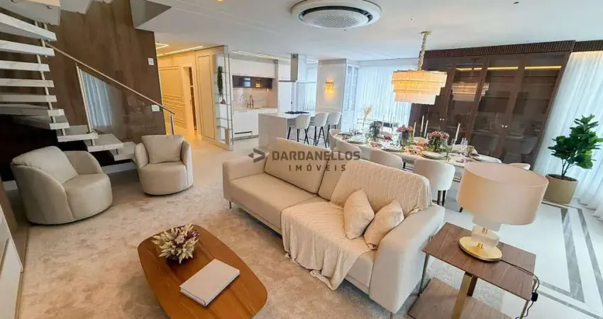 O Imóvel: cobertura duplex mobiliada, equipada e decorada, com 326 m² privativos, 04 suítes, lavabo social, living integrado com sala de estar e sala de jantar, cozinha, sacada com churrasqueira à carvão, área de serviço e 02 vagas de garagem.