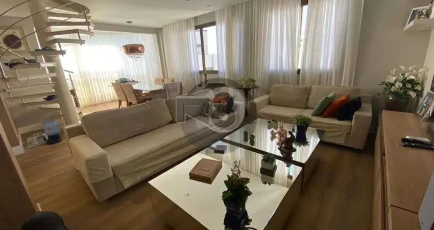 Excelente cobertura, localização a poucos passos da Beira Mar Norte, totalmente remodelada, inclusive parte hidráulica e elétrica com móveis planejados por todos os cômodos, bem como splits. Com 4 dormitórios, sendo 2 suítes, sala em L cozinha com conceito aberto finamente mobiliada, bem como todos os espaços foram bem pensados e otimizados. A mesma apresenta um espaço Gourmet e churrasco fechado em vidros e com acesso piscina particular e linda vista panorâmica, mar e ilhas. Condomínio com salão de festa, piscina, garagem para dois veículos separados.