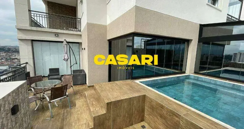 Espetacular cobertura duplex à venda no Nova Petrópolis, em São Bernardo do Campo, com 420 m² de área útil e 665 m² de área total. O imóvel oferece 4 suítes, 7 banheiros, sala com 5 ambientes, sala íntima, sauna privativa e cozinha planejada. Totalmente automatizada, conta com Alexa integrada, controle de iluminação, ar-condicionado e televisores. Destaque para o home theater com som 7.2, som ambiente em todos os cômodos, iluminação em LED e acabamentos de altíssimo padrão. Na área externa: piscina com hidromassagem e cascata, espaço gourmet completo com adega, chopeira, churrasqueira parrilha, chapeira e exaustor potente, tudo envidraçado para conforto e integração. O imóvel possui ainda 5 vagas de garagem, depósito amplo e hall de entrada exclusivo com vista para o pôr do sol. Condomínio com lazer estilo clube. Ideal para quem busca luxo, conforto, segurança e tecnologia.