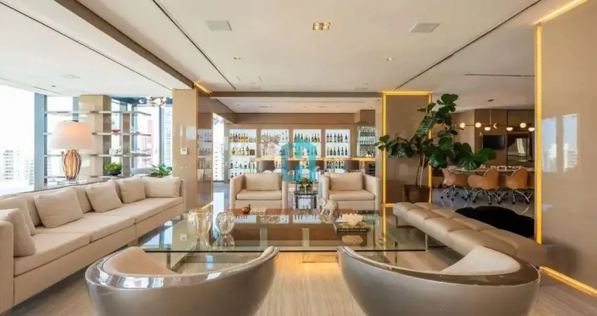 Esta cobertura duplex é impecável, totalmente reformada, e seu acabamento foi feito com muito capricho, requinte e exclusividade, são 800m² privativos e de muito conforto. Piso inferior: living para 5 ambientes, revestido em mármore carrara e mármore grego no piso, lareira a gás, integrado com a varanda onde possui janelões que permite a entrada de luz natural. No longe com pé direito alto e jardim suspenso, você desfrutará de um delicioso bar. Piso superior: área íntima com 4 suítes, todos os banheiros em mármore Armani Grigio, exceto a suíte máster que possuí walk-in closet, banho sr. e sra., com banheira e revestido em mármore grego, e tendo como parte da decoração um jardim vertical. Neste mesmo piso, dispõe de cozinha, sala home theater com automação completa, espaço gourmet e área externa com piscina e uma bela vista, para desfrutar com sua família e amigos. Na garagem dispõe de 6 vagas. A localização é privilegiada, para quem preza qualidade de vida, definitivamente Moema é um dos melhores bairros para morar em São Paulo.