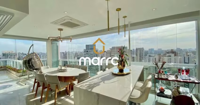 Maravilhosa cobertura duplex com 272m² à venda na Vila Nova Conceição. PISO INFERIOR: Amplo living com 2 ambientes, lavabo, varanda com integração à cozinha e sala, persianas automatizadas, ar condicionado, marcenaria de alta qualidade, área de serviço com banheiro e despensa, e uma área externa com solaruim e piscina. Muita iluminação natural e uma vista deslumbrante da cidade. PISO SUPERIOR: Planta original de 4 suítes, porém adaptada para 3 suítes, sendo a suíte master com 2 banheiros e 2 clostes. Caso precise das 4 suítes, a reversão é muito simples, só retirar os armários do segundo closet e volta a ser a suíte normalmente. Os cômodos estão repletos de armários e ar condicionado, banheiros com finos acabamentos, ótima iluminação e acesso de 2 suítes ao terraço, que está sendo usado como escritório do casal. O condomínio é um dos mais cobiçados da Vila Nova, pertinho do Parque Ibirapuera e com uma excelente infraestrutura de lazer