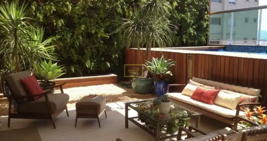 Cobertura com 275 m² de área útil, sendo uma suíte master de dois banheiros e varanda própria, outras duas suítes com varanda própria e outra sem, além de jardim, piscina e churrasqueira. Os móveis e acessórios são opcionais e ainda conta com 05 vagas.