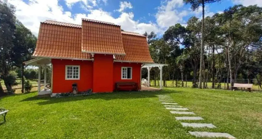 Chalé: 1 suíte, sala com lareira, cozinha e garagem.